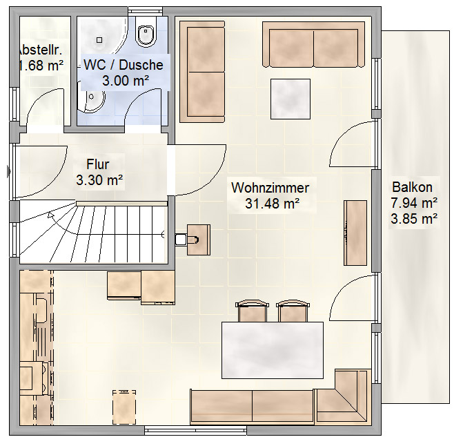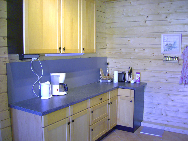- Küche mit Kühlschrank und Gefrierfach, Backofen mit Ceranfeld, Dunstabzugshaube, Wasserkocher, Spülmaschine, Kaffeemaschine, Toaster komplett ausgestattet mit Geschirr und Besteck
