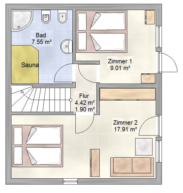 - 2 Schlafzimmer (1 mit Doppelbett und Doppel-Schlafsofa und 1 x Doppelbett), kleiner Fernseher, Fußbodenheizung