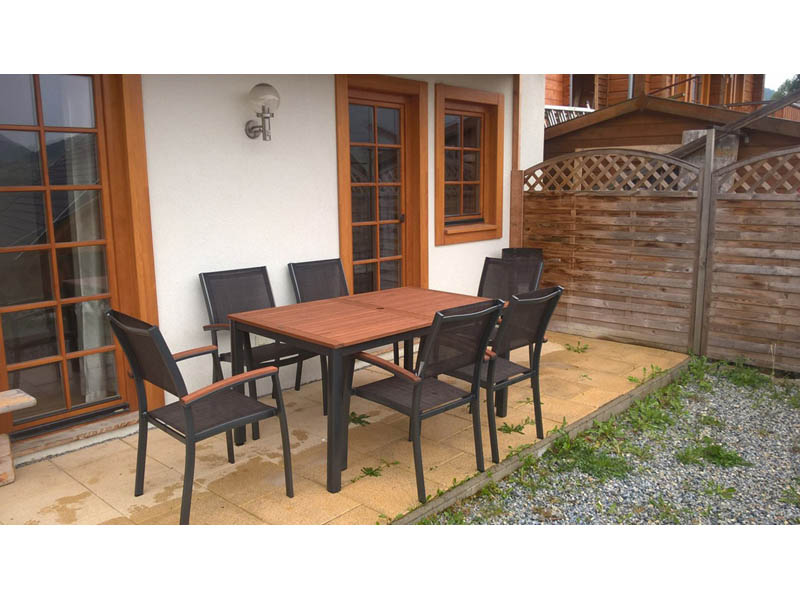 Gemütliches Ferienhaus mit Galerie – Holzblockbohle im Obergeschoss und gemauert im Untergeschoss mit Balkon und Terrasse
