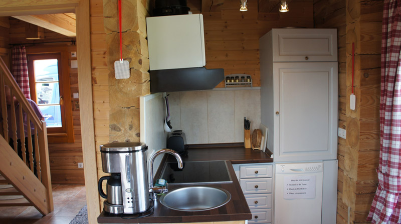 • kuscheliges kleines Wohn-Esszimmer mit Küche (Kühlschrank mit Gefrierfach, Backofen, Dunstabzugshaube, Wasserkocher, Spülmaschine, Kaffeemaschine, Toaster, komplett mit Geschirr ausgestattet), SAT-TV, Kamin, Fußbodenheizung