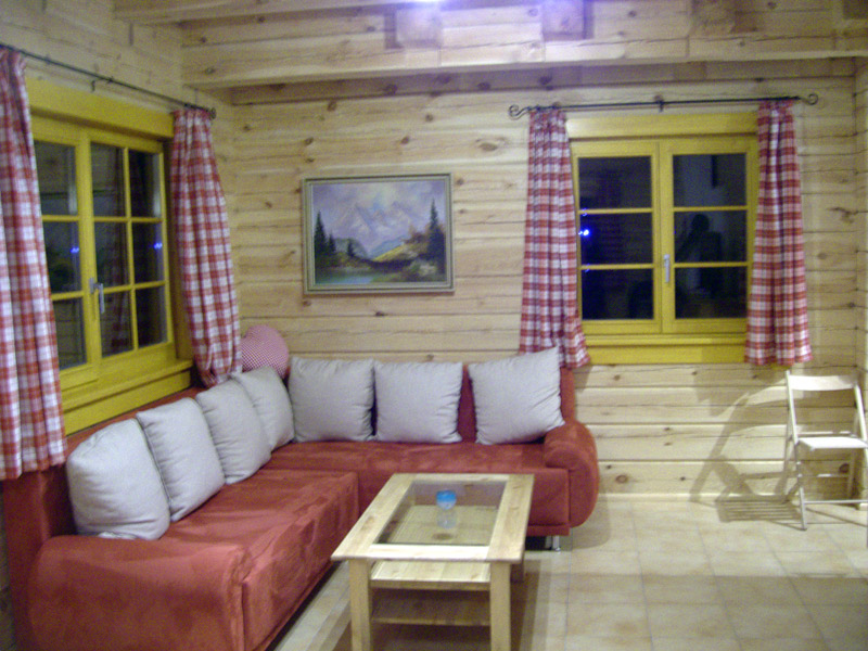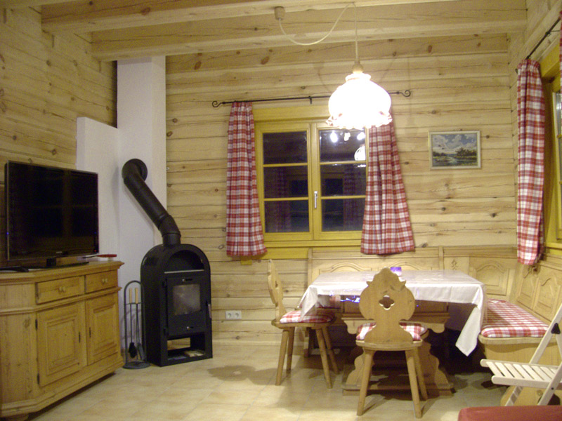 - gemütliches Wohn-Esszimmer mit großem roten Kuschelsofa, SAT-TV, Kamin und Fußbodenheizung.